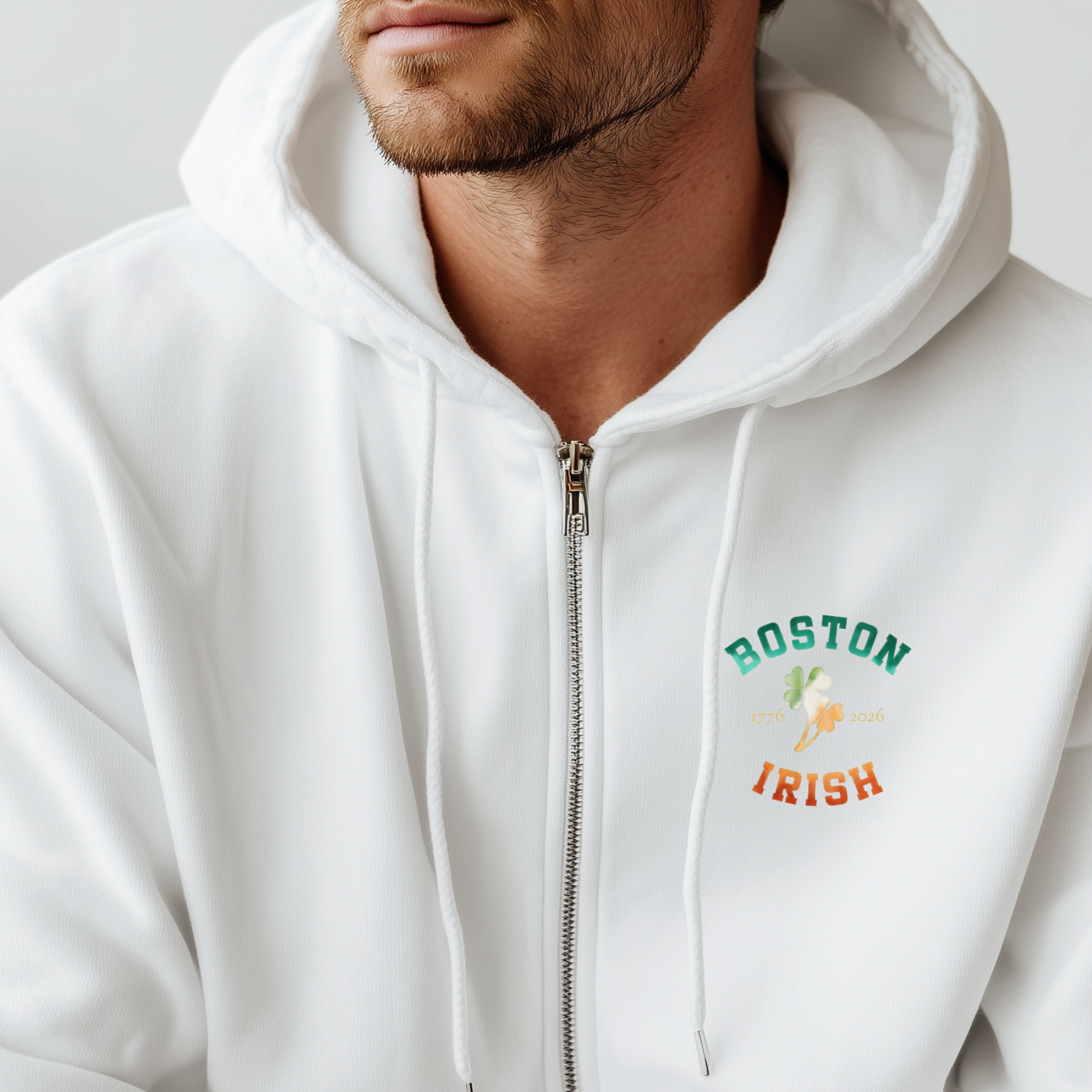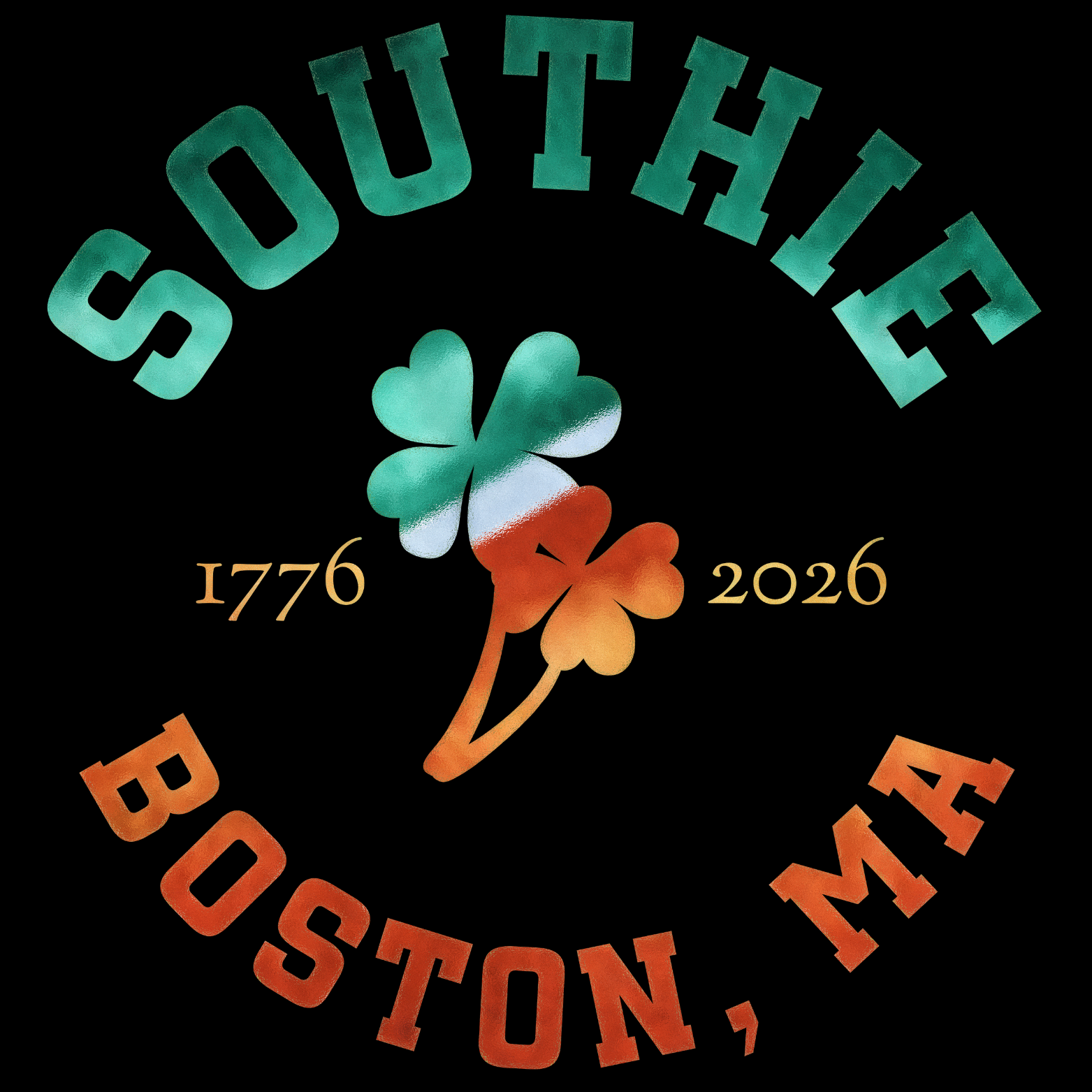 Our Boston Irish shamrock design was made with a vintage Boston font, the shamrock and 1776-2026. The entire design has an Ireland flag watercolor texture applied with the final frosted glass effect added over it all done in Photoshop.