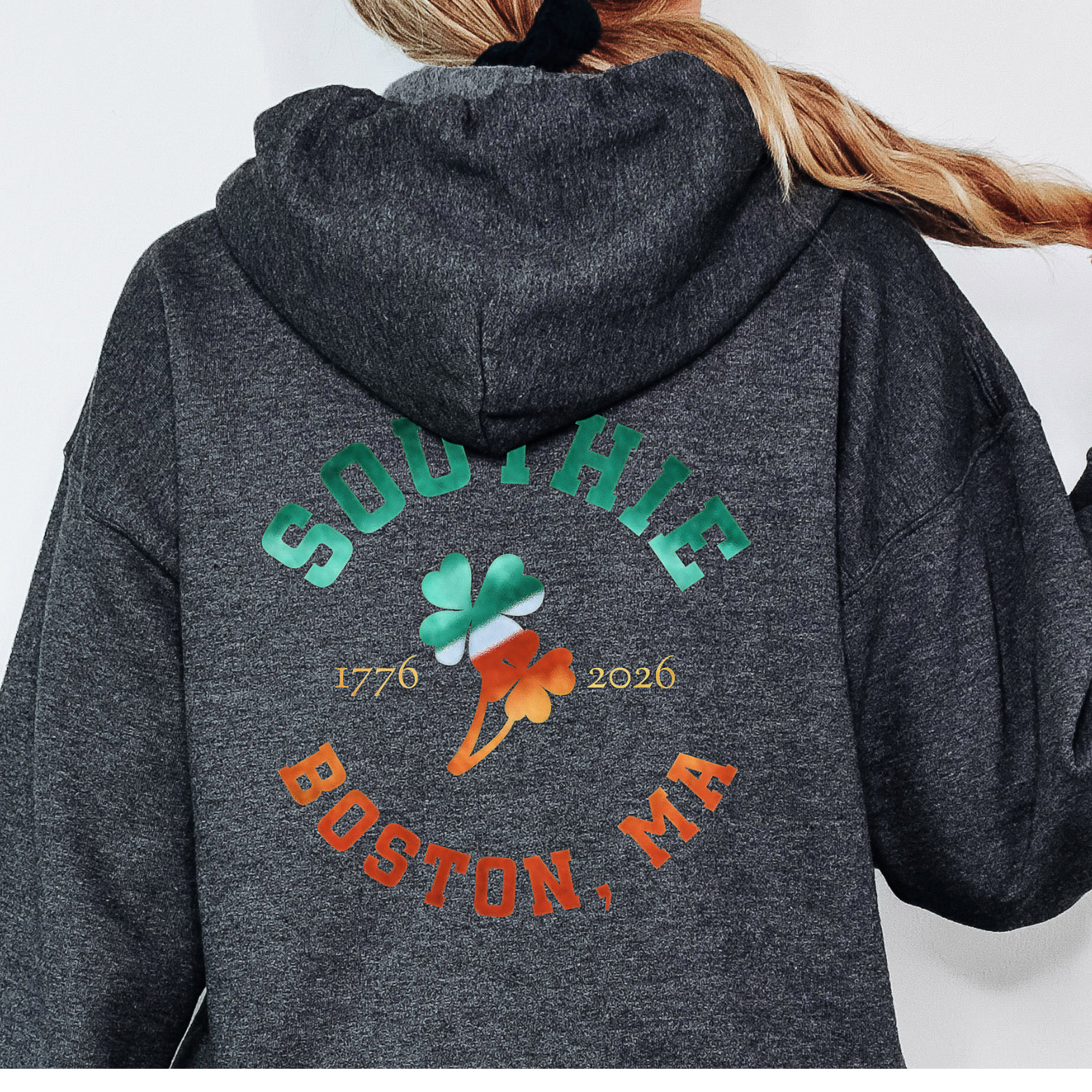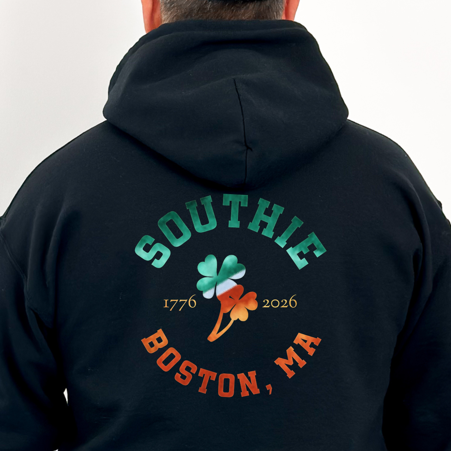 The Southie Boston graphic design, placed on the back of the hoodie, was created using the same technique as the front Boston Irish design. The same Ireland flag colors were use just a little bolder.